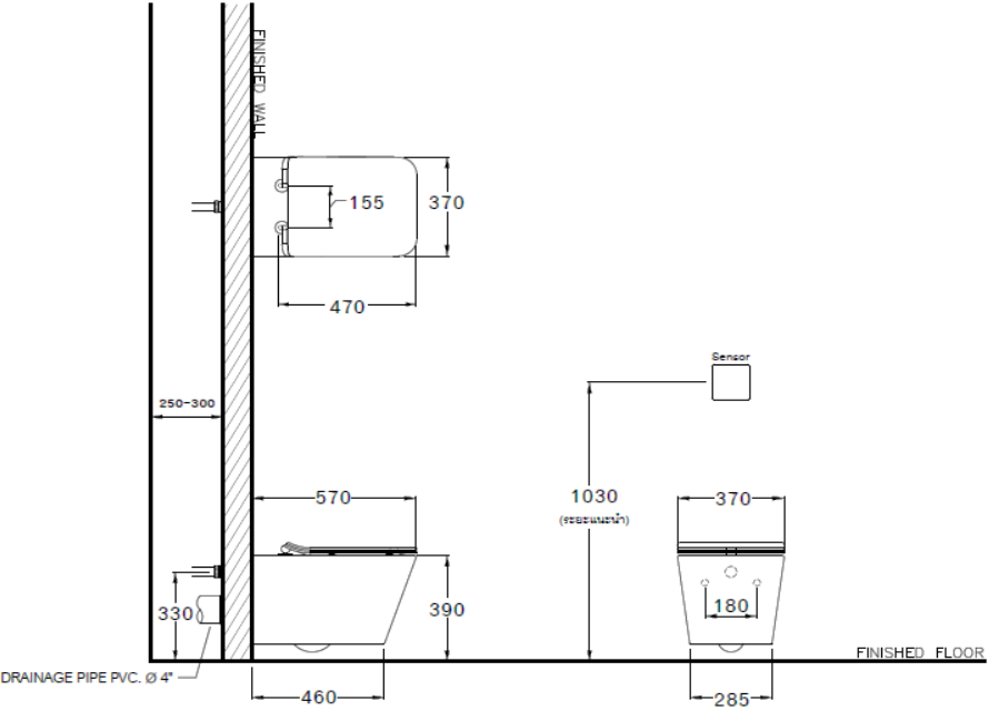 Thiết kế: Thân vuông dài, thoát ngang, tâm xả 330mm