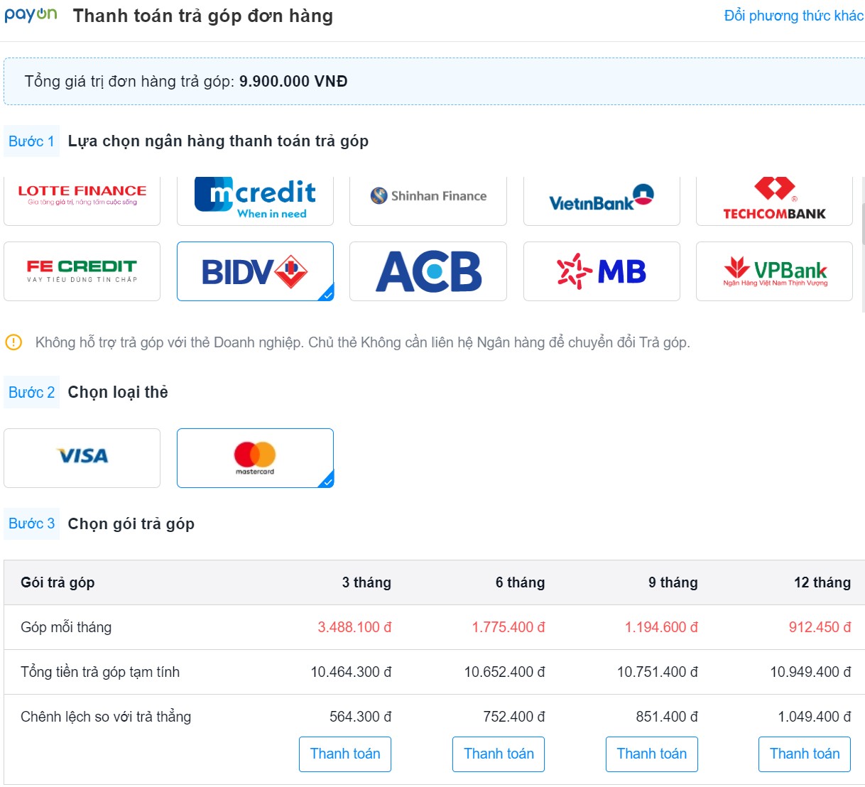 - Trả góp 0% bằng thẻ tín dụng